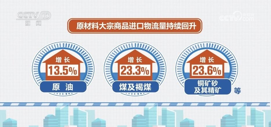 從貨類看,10月份,在消費(fèi)帶動下,糧食、大豆、食用油等進(jìn)口量增速超過20%。原油、煤及褐煤、銅礦砂及其精礦等原材料大宗商品進(jìn)口物流量持續(xù)回升,分別增長13.5%、23.3%和23.6%。