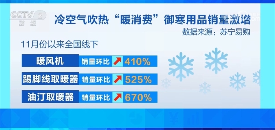 ?????? 數(shù)據(jù)顯示,11月份以來,某家電賣場全國線下暖風機銷量環(huán)比增長410%,踢腳線取暖器銷量環(huán)比增長525%,油汀取暖器銷量環(huán)比增長670%。此外,某電商平臺上,暖鞋器、發(fā)熱圍脖、水暖毯、電暖桌等新型取暖設備的銷售額環(huán)比增長超過一倍。