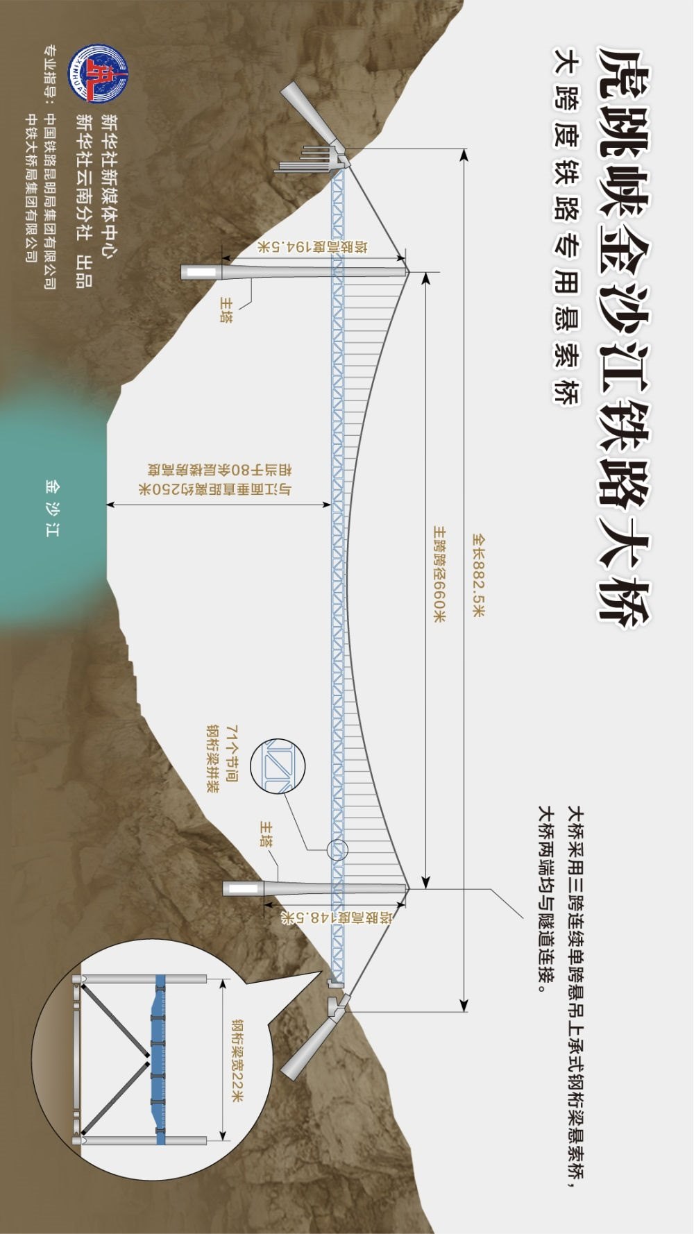 虎跳峽金沙江鐵路大橋,全長882.5米,主跨跨徑660米,兩端均與隧道連接。大橋主纜跨度大、鋼梁自重大,兩岸山坡陡峭,施工場地有限。