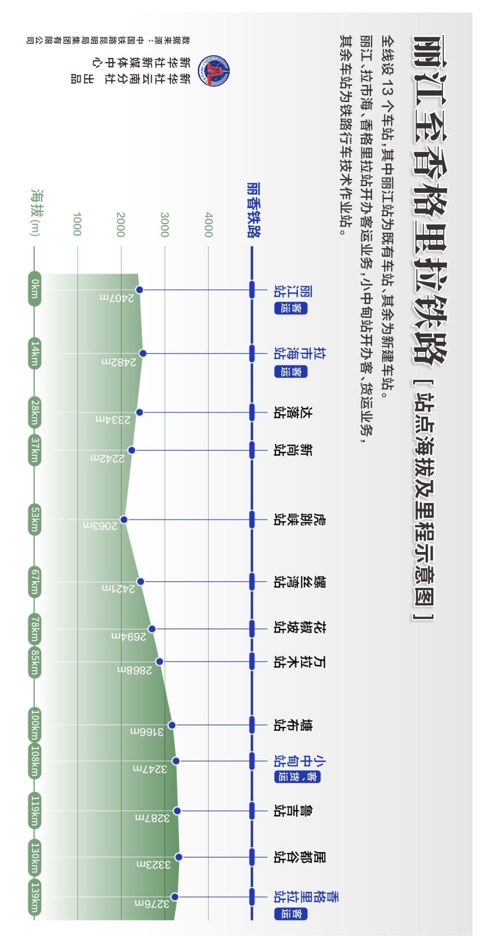 全線共設有13個車站,其中麗江站為既有車站,其余為新建車站。麗江、拉市海、香格里拉站開辦客運業(yè)務,小中甸站開辦客、貨運業(yè)務,其余車站為鐵路行車技術作業(yè)站。