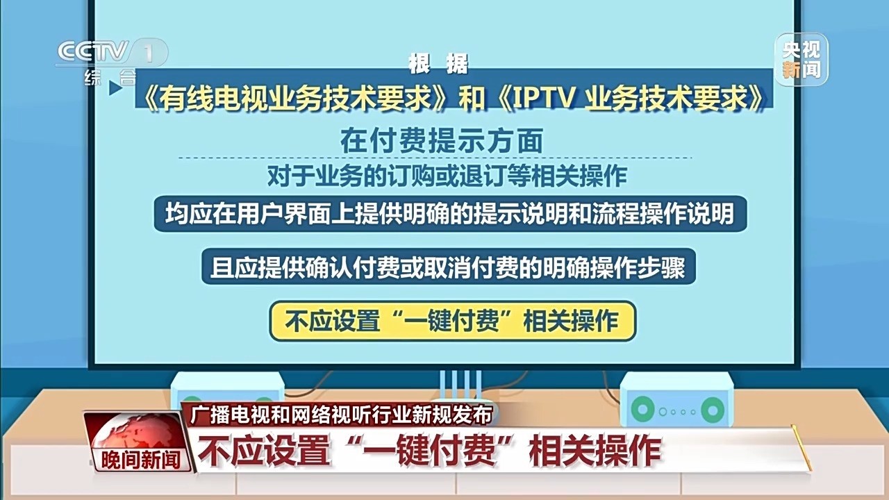 在付費(fèi)提示方面,對(duì)于業(yè)務(wù)的訂購(gòu)或退訂等相關(guān)操作,均應(yīng)在用戶(hù)界面上,提供明確的提示說(shuō)明和流程操作說(shuō)明,且應(yīng)提供確認(rèn)付費(fèi)或取消付費(fèi)的明確操作步驟,不應(yīng)設(shè)置“一鍵付費(fèi)”相關(guān)操作。此外,有線(xiàn)電視和IPTV遙控器應(yīng)具備快捷看直播頻道的按鍵,通過(guò)此按鍵直接進(jìn)入全屏直播,按鍵名稱(chēng)應(yīng)為“看電視”。
