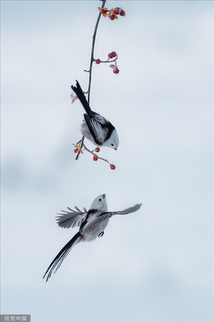 黑龍江大慶,城市森林公園,北長尾山雀在雪中嬉戲、打斗、覓食。