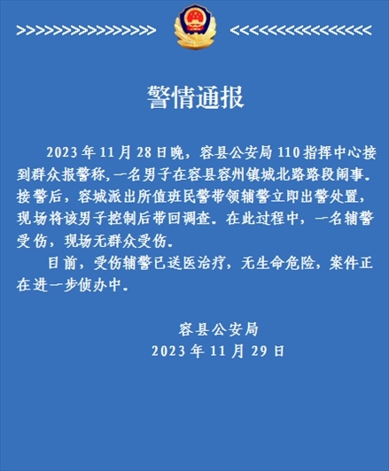 ·廣西容縣警方通報“男子鬧事致輔警受傷”:已將其帶回調(diào)查,輔警無生命危險。