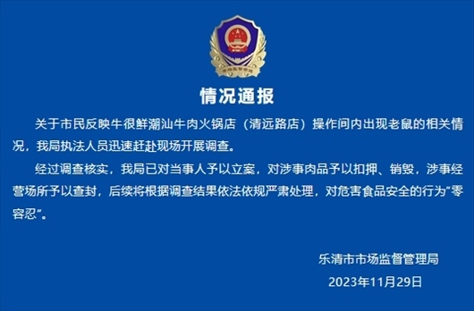 ·溫州樂清官方通報火鍋店現(xiàn)老鼠啃牛排:已對當事人予以立案,對涉事肉品予以扣押、銷毀,涉事經(jīng)營場所予以查封。