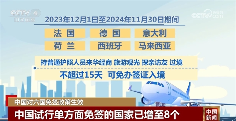 2023年12月1日至2024年11月30日期間,法國、德國、意大利、荷蘭、西班牙、馬來西亞6個國家持普通護(hù)照人員來華經(jīng)商、旅游觀光、探親訪友和過境不超過15天,可免辦簽證入境。至此,我國試行單方面免簽的國家從原先2個(文萊、新加坡)增加至8個,覆蓋國家也從亞洲擴(kuò)大至歐洲。