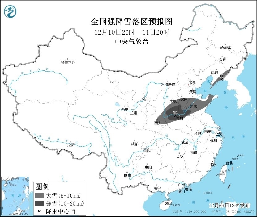 預計,12月9日20時至12月11日20時,陜西中部和北部、山西中南部、河北南部、河南北部、山東中北部、遼寧東部、吉林東南部等地的部分地區(qū)有大到暴雪,上述地區(qū)新增積雪深度5~10厘米,局地12~15厘米。主要降雪時段為10日。