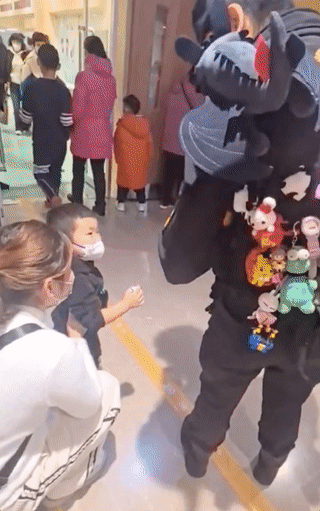 一名保安在后背上掛滿玩偶