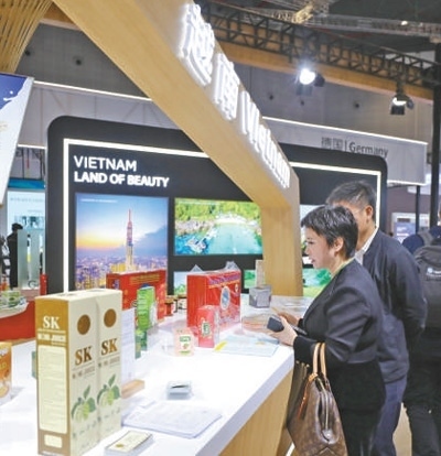 11月6日,參觀者在第六屆進(jìn)博會(huì)國家展越南展臺(tái)挑選商品。新華社記者 李夢嬌攝