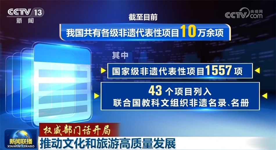 繁榮發(fā)展文化事業(yè)和文化產(chǎn)業(yè),推進(jìn)城鄉(xiāng)公共文化服務(wù)體系提質(zhì)增效。今年前11個月,文化和旅游部主辦27項展演展示活動,線下觀眾90萬人次,線上觀看量超過18億次,一批彰顯中華審美風(fēng)范、富有鮮明時代氣息的舞臺藝術(shù)作品廣受好評。保護(hù)傳承弘揚(yáng)中華優(yōu)秀傳統(tǒng)文化,中華文明探源工程、考古中國等重大項目得以深入實施,截至目前,我國共有各級非遺代表性項目10萬余項,其中國家級非遺代表性項目1557項,43個項目列入聯(lián)合國教科文組織非遺名錄(名冊),中國世界遺產(chǎn)數(shù)量增至57項。