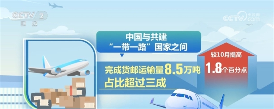 國際航線中,我國航空公司在中國至歐洲航線完成貨郵運輸量最大,達10.9萬噸,占比近四成;中國至亞洲其他國家航線貨運恢復水平最高;中國至北美航線貨運繼續(xù)恢復,完成6.2萬噸;中國與共建“一帶一路”國家之間完成貨郵運輸量8.5萬噸,占比超過三成,較10月提高1.8個百分點。