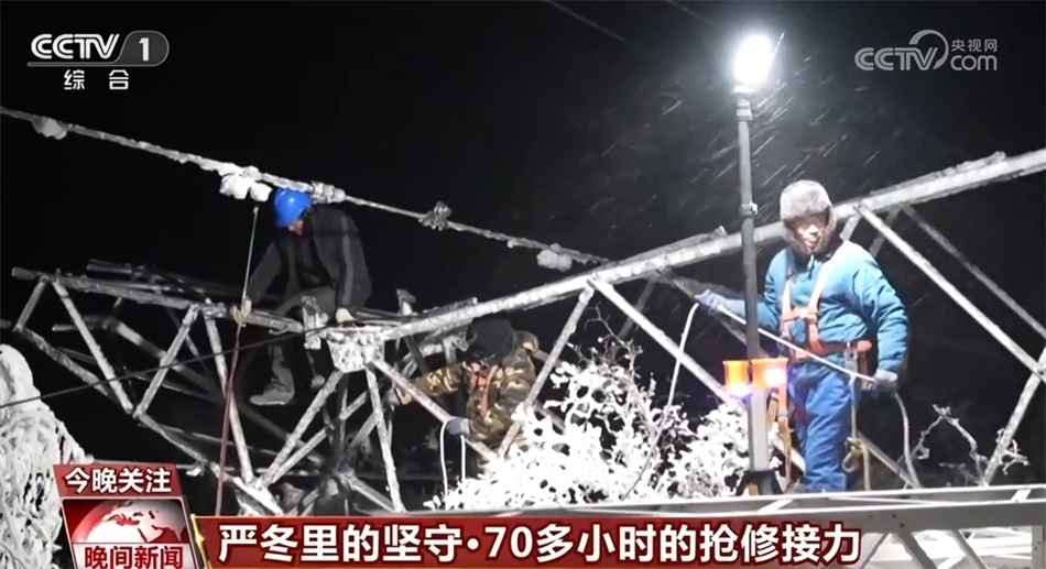 總臺(tái)記者 崔肖冉:這里的海拔超過(guò)1200米,現(xiàn)在室外氣溫降至零下20℃,感覺(jué)進(jìn)入了一個(gè)冰窖。我在室外大概走上15分鐘左右,就感覺(jué)整個(gè)關(guān)節(jié)凍得發(fā)疼,而此時(shí)此刻在距離地面大概20多米的高空,維修人員正在輸電線(xiàn)路上進(jìn)行緊急搶修,而且今天晚上風(fēng)很大,可想而知搶修難度有多大。