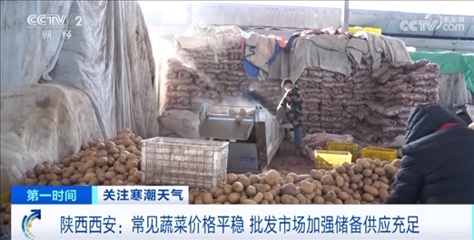 在西安一家大型農(nóng)副產(chǎn)品批發(fā)市場,為了應(yīng)對寒潮天氣帶來的影響,常年做蔬菜批發(fā)生意的戴建軍早在土豆產(chǎn)地建起庫房,大量收購?fù)炼?,增加運輸車輛,確保土豆能及時運到西安。