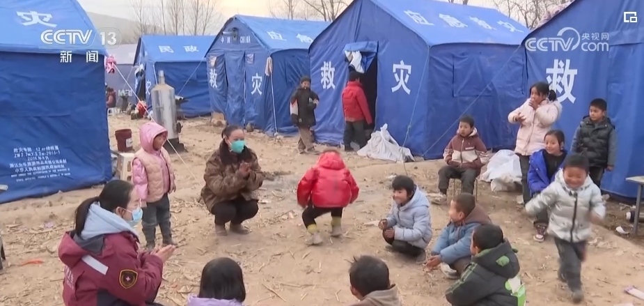 在康吊村三社的臨時(shí)安置點(diǎn),來(lái)自甘肅省第二人民醫(yī)院的心理治療師李轉(zhuǎn)雄正帶著村里的孩子做游戲。丟手絹、老鷹抓小雞,在一遍又一遍的追逐當(dāng)中,孩子們的笑聲越來(lái)越響亮。