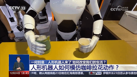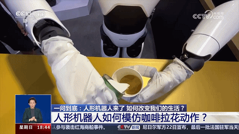 2023年8月,2023世界機器人大會在北京開幕,現(xiàn)場有個人形機器人可以模仿“咖啡拉花”動作——開始,把兩個杯子(裝有咖啡、牛奶)遞給人形機器人;稍后,人形機器人運行AI智能算法,指揮它用“手”完成“咖啡拉花”作業(yè)。