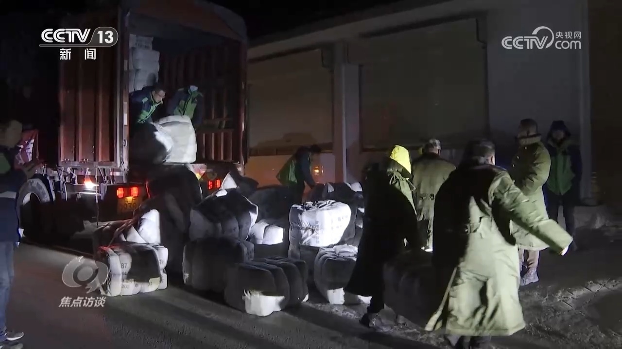 為了盡快給村民送去保障物資,刁四村村民的車隊日夜兼程。22日凌晨,歷經(jīng)32個小時,帶著全村2000多人的囑托,這個車隊跨越1600公里,終于抵達(dá)了積石山縣的安集鎮(zhèn)。顧不上休息,刁四村的村民就和當(dāng)?shù)卮迕褚黄鸢沿浳镄读讼聛?。五車物資,足足卸了三個小時,其中包括2400件軍大衣、2580件棉被、1820副自發(fā)熱鞋墊。