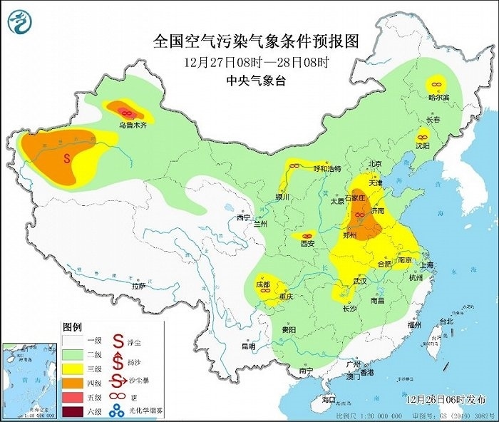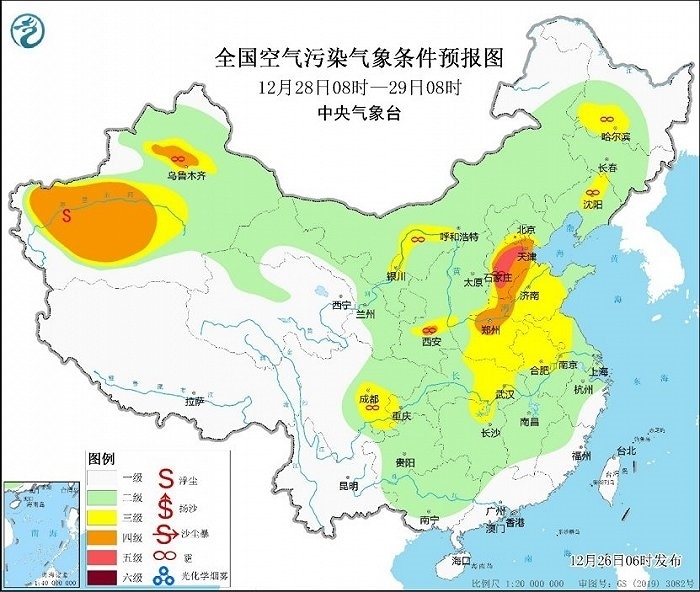 冷空氣勢力弱,霧和霾天氣又要登場。今天,華北、黃淮等地有輕度霾,局地中度或重度霾,27日華北中南部大氣擴(kuò)散條件將有所改善。28日至30日,華北中南部、黃淮中西部、汾渭平原等地大氣擴(kuò)散條件再次轉(zhuǎn)差,將有輕至中度霾,部分地區(qū)重度霾。此外,28日至30日的夜間至上午時(shí)段,華北中南部、黃淮、江淮東部、江漢、四川盆地等地的部分地區(qū)有大霧,局地有能見度不足200米的強(qiáng)濃霧。