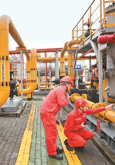 在位于重慶涪陵的中國首個投入商業(yè)開發(fā)頁巖氣田——涪陵頁巖氣田白濤集輸站,技術人員對設備進行巡檢。新華社記者 王全超攝