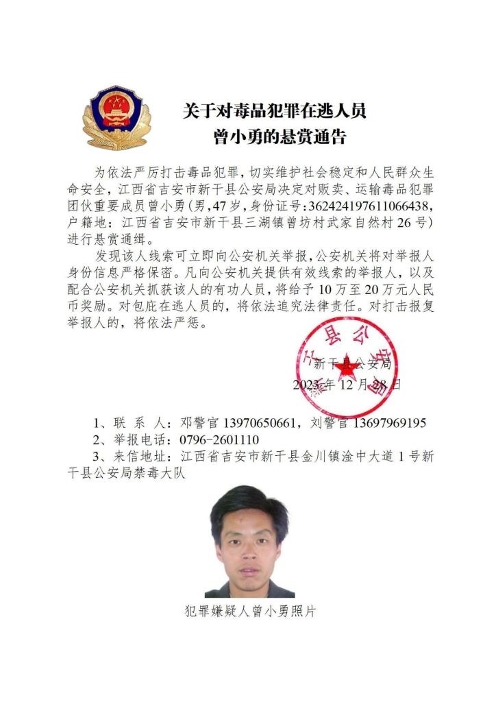 其中,湖南省郴州市公安局決定對(duì)張安龍、馬文祥、吳玉楊進(jìn)行公開懸賞通緝;湖南省株洲市公安局決定對(duì)楊金梅進(jìn)行公開懸賞通緝;江西省新干縣公安局決定對(duì)曾小勇、李國平、孫強(qiáng)進(jìn)行公開懸賞通緝;浙江省溫州市公安局決定對(duì)顏歡平進(jìn)行公開懸賞通緝;四川省遂寧市公安局決定對(duì)母朝東進(jìn)行公開懸賞通緝;貴州省黔東南州公安局決定對(duì)龍華進(jìn)行公開懸賞通緝。