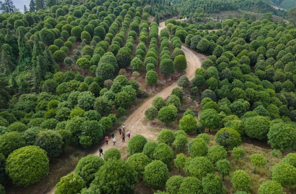 5月14日,李秀雄一家和工人走在四川省榮縣東興鎮(zhèn)長(zhǎng)興林場(chǎng)(無(wú)人機(jī)照片)。25年來(lái),李秀雄一家三代接力植樹(shù)造林,讓3000畝荒山變林海。