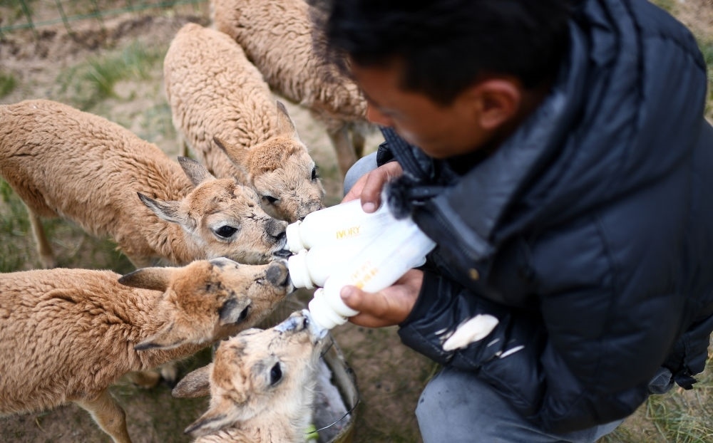 青海三江源國(guó)家公園可可西里管理處索南達(dá)杰保護(hù)站隊(duì)員才仁多杰在給被救助的藏羚羊幼仔喂奶(7月28日攝)。