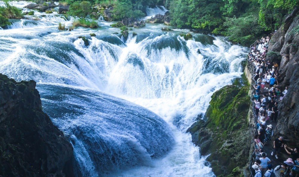 8月16日,游客在貴州省安順市黃果樹(shù)瀑布景區(qū)游覽(無(wú)人機(jī)照片)。