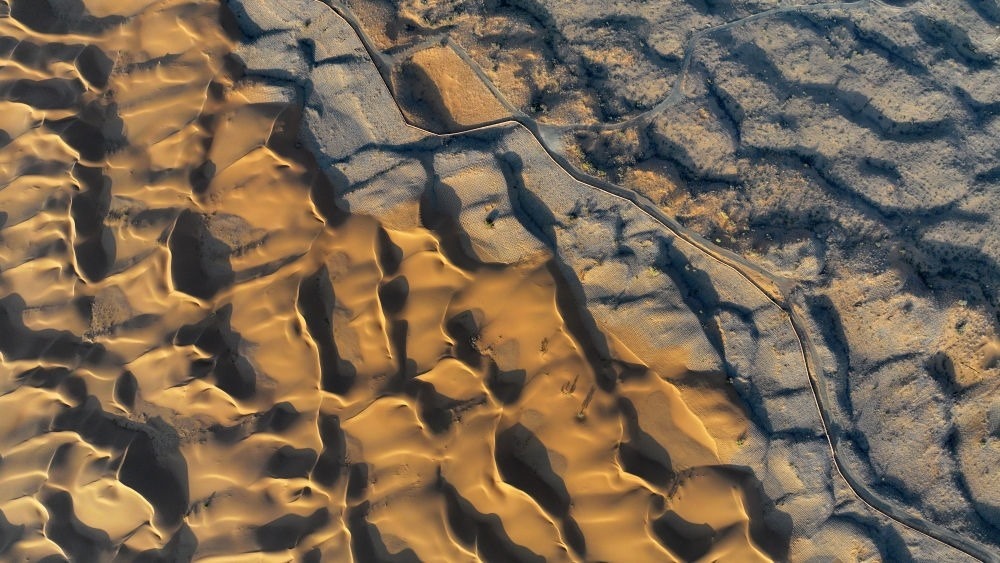 位于寧夏中衛(wèi)市沙坡頭騰格里沙漠邊緣的治沙林帶與沙漠交匯處(9月6日攝,無(wú)人機(jī)照片)。