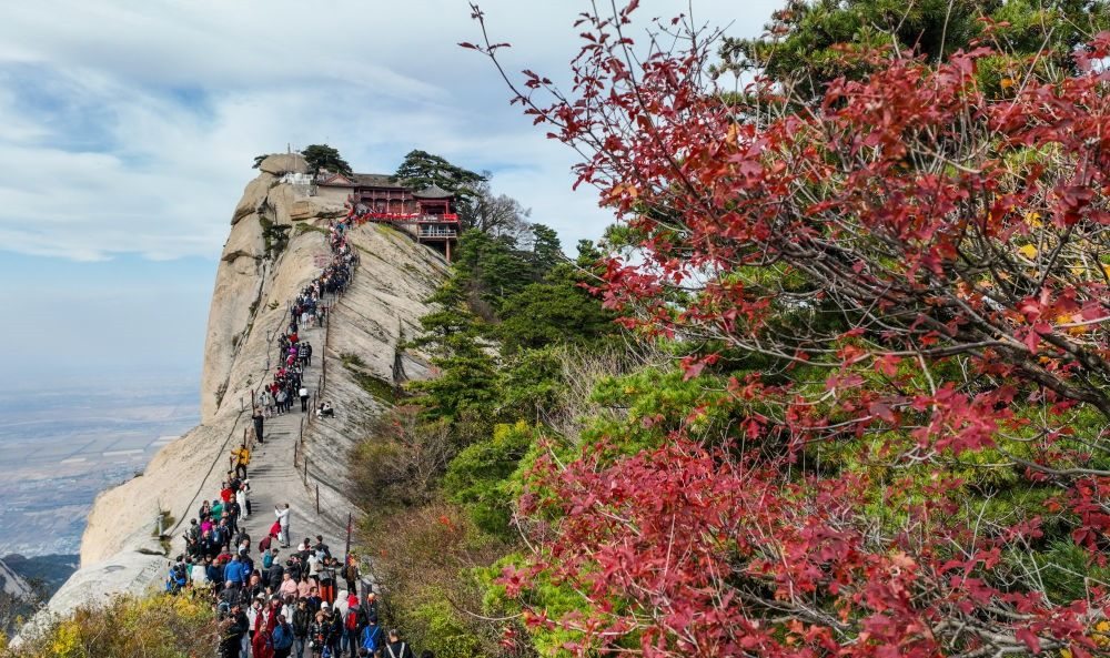 10月19日,游人在攀登西岳華山蓮花峰(無(wú)人機(jī)照片)。