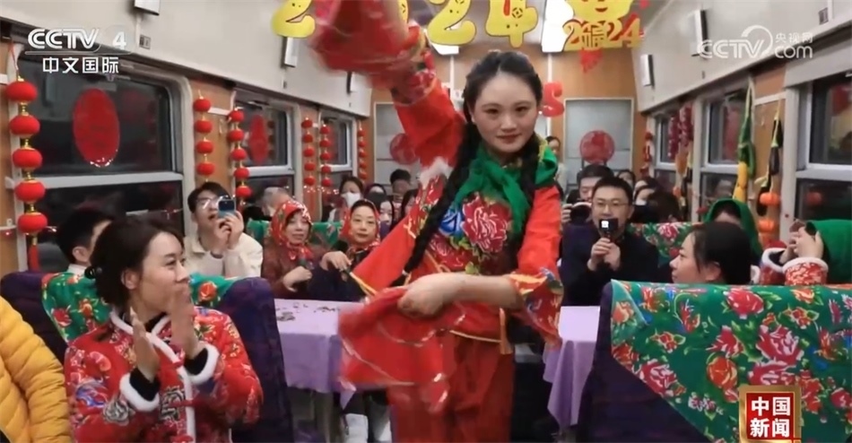 總臺(tái)央視記者 楊曜語:我即將登上的列車就是從哈爾濱開往漠河的國內(nèi)首個(gè)沉浸式東北民俗文化體驗(yàn)列車,坐過的人都說一上車就想盤腿兒了,我們趕緊來體驗(yàn)一下!一上車我就被濃濃的東北文化所感染到了,整個(gè)車廂都被東北大花的經(jīng)典配色裝飾著,再加上隨手就能品嘗到東北特色美食,坐在床鋪上就感覺一秒鐘“穿越”到農(nóng)家炕頭。