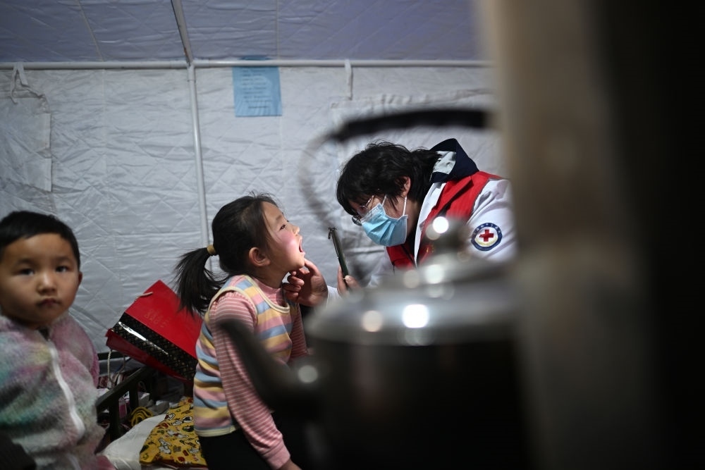 在青海省海東市民和回族土族自治縣官亭鎮(zhèn)喇家村安置點,山東援青醫(yī)生李鴻皓(右)為喇生婷檢查身體(12月23日攝)。積石山6.2級地震發(fā)生以來,在青海省海東市民和回族土族自治縣,當?shù)蒯t(yī)療機構(gòu)和援青醫(yī)療隊通過設立醫(yī)療點、開展巡診等方式保障安置點群眾就醫(yī)服務,守護群眾健康。新華社記者 張宏祥 攝