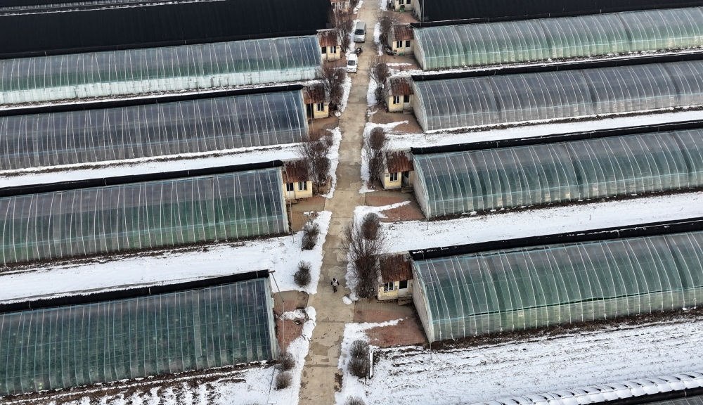 在天津市西青區(qū)辛口鎮(zhèn)水高莊村拍攝的修繕后的大棚一景(12月12日攝,無人機照片)。新華社記者 李然 攝