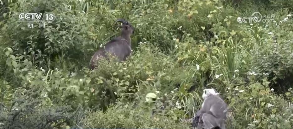 突然,林間騷動起來,幾只長尾葉猴從天而降來到塔爾羊中間,這是首次記錄到這兩個物種群體同框覓食的珍貴畫面。對它們而言,聚在一起可以加強警戒,更容易發(fā)現(xiàn)天敵。
