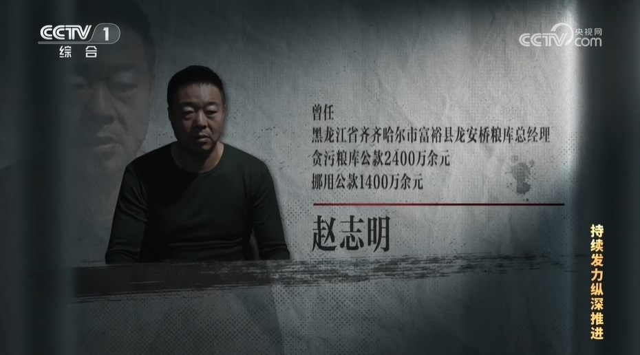 【解說詞】趙志明曾是黑龍江省齊齊哈爾市富裕縣龍安橋糧庫總經(jīng)理,經(jīng)查,他貪污糧庫公款2400萬余元,挪用公款1400萬余元,2023年3月被判處有期徒刑14年。龍安橋糧庫是在2015年由5家國有糧庫改革重組的,富??h政府持股51%、民營企業(yè)鼎倉公司持股49%。趙志明原本是鼎倉公司的老板,在這次改制中當(dāng)上了龍安橋糧庫總經(jīng)理。