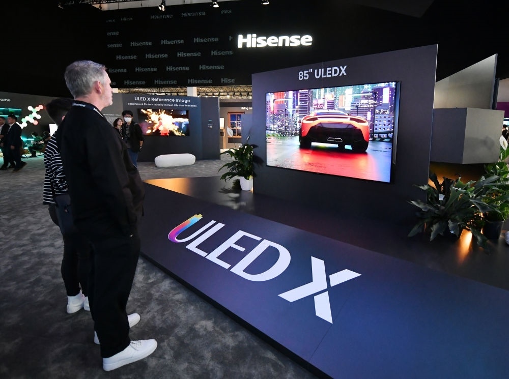 2023年9月1日,參觀者在德國柏林國際消費(fèi)電子展海信展區(qū)觀看ULED X參考級影像電視。新華社記者 任鵬飛 攝