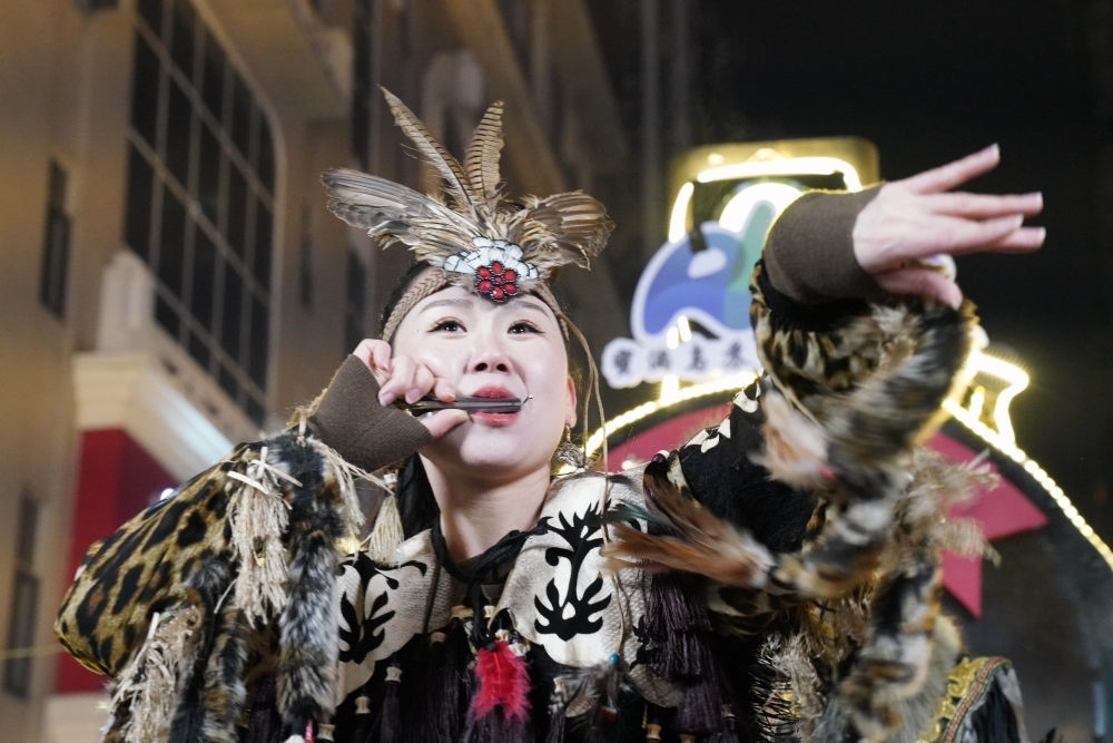 ↑1月6日,身著赫哲族服飾的赫哲族群眾在表演吹奏口弦琴。