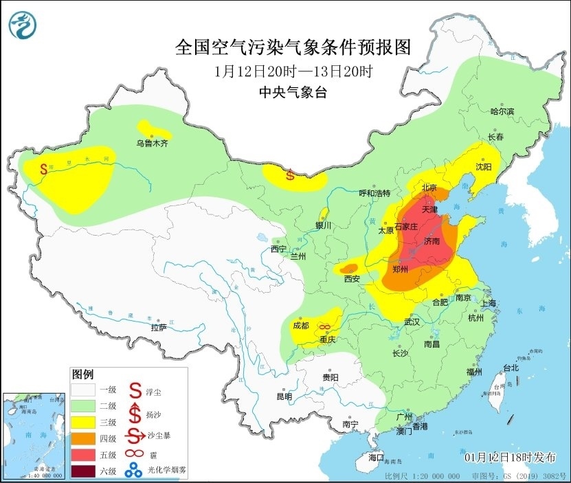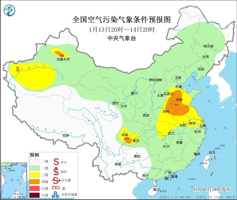 12日夜間至13日,華北中南部、黃淮、江淮、江漢、四川盆地等地大氣擴(kuò)散條件較差,有輕至中度霾,其中天津、河北南部、山東西部、河南中北部等地有重度霾。14日白天起,受冷空氣影響,上述地區(qū)霾天氣自北向南逐漸減弱消散。