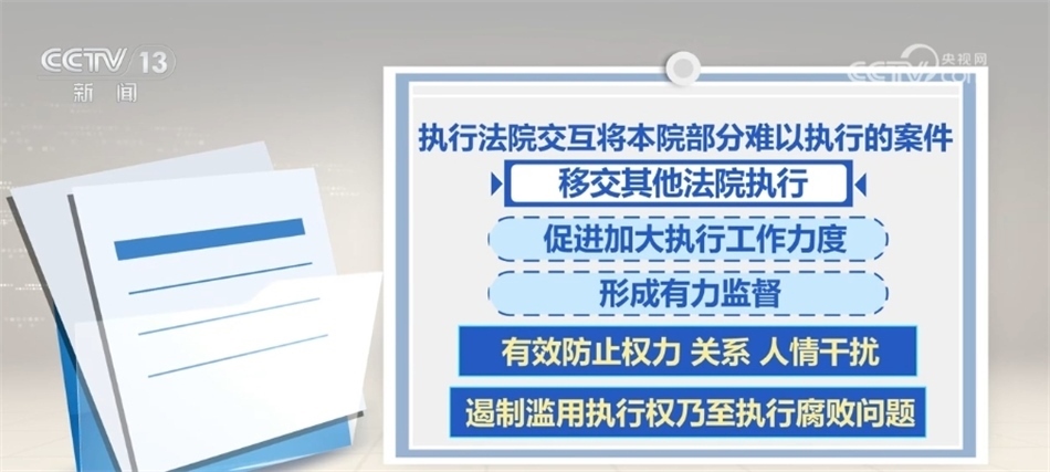 2023年10月,最高人民法院部署開展交叉執(zhí)行工作試點。據(jù)介紹,交叉執(zhí)行是指通過指定、提級執(zhí)行,執(zhí)行法院交互將本院部分難以執(zhí)行的案件移交其他法院執(zhí)行,促進加大執(zhí)行工作力度,并形成有力監(jiān)督,有效防止權力、關系、人情干擾,遏制濫用執(zhí)行權乃至執(zhí)行腐敗問題。