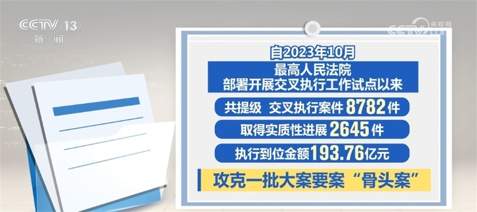 最高人民法院介紹,執(zhí)行難中常見被執(zhí)行人是當?shù)刂匾髽I(yè)、納稅大戶,甚至是重點國企或行政部門等情況。交叉執(zhí)行就是要讓接受指定的法院在不受牽絆、沒有包袱、完全依法自主的條件下力推案件執(zhí)行。據(jù)統(tǒng)計,開展交叉執(zhí)行工作試點以來,共提級、交叉執(zhí)行案件8782件,取得實質性進展2645件,執(zhí)行到位金額193.76億元,攻克了一批大案要案“骨頭案”。最高人民法院要求,上級法院發(fā)現(xiàn)原執(zhí)行法院存在消極執(zhí)行、拖延執(zhí)行等執(zhí)行不力情形,發(fā)現(xiàn)違紀違法問題線索的,應當嚴肅依紀依法查處、追究責任。