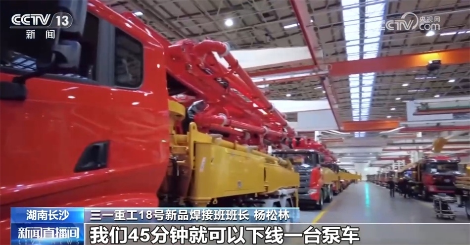 三一重工18號(hào)新品焊接班班長(zhǎng) 楊松林:大家好,我是新品焊接班班長(zhǎng)楊松林。我們工廠主要是生產(chǎn)泵車(chē),看,就是我身后的這個(gè)大家伙。我們45分鐘就可以下線一臺(tái)泵車(chē)。