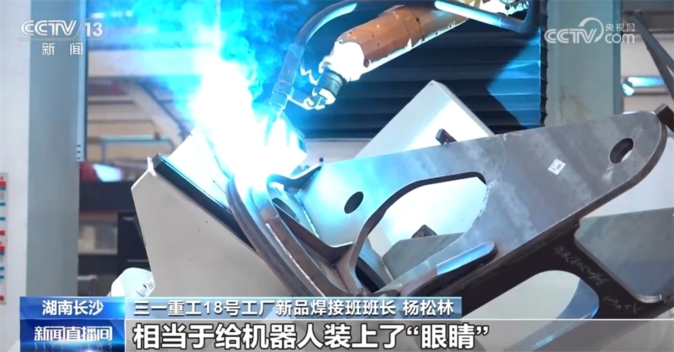 三一重工18號(hào)工廠新品焊接班班長(zhǎng) 楊松林:這就是我工作的地方。這邊有一排排的工作島,穩(wěn)居“C”位的就是我們的轉(zhuǎn)臺(tái)焊接工作島。依托數(shù)字化電弧跟蹤技術(shù),相當(dāng)于給機(jī)器人裝上了“眼睛”,焊槍可以自己去尋找鎖定,并跟蹤焊點(diǎn),實(shí)現(xiàn)連續(xù)性的焊接,在行業(yè)還是首創(chuàng),我們的效率和質(zhì)量都大大提升了。