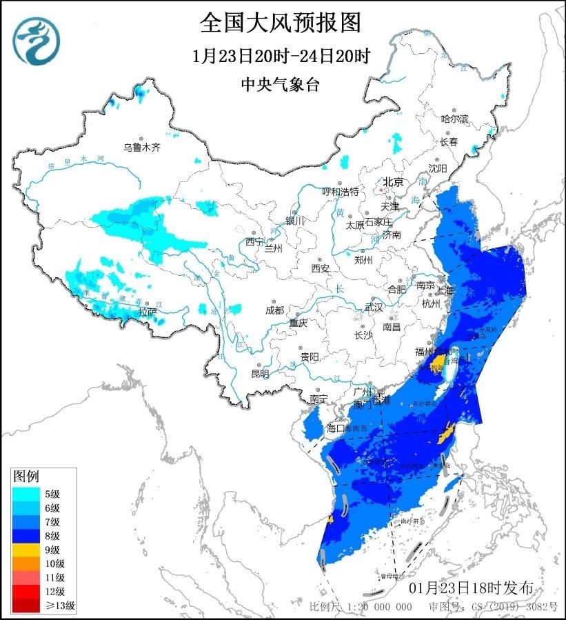 中央氣象臺1月23日18時繼續(xù)發(fā)布大風(fēng)藍色預(yù)警:預(yù)計,1月23日20時至24日20時,西藏南部、青海西部、福建沿海、廣東沿海等地的部分地區(qū)有5~6級、陣風(fēng)7~8級的大風(fēng);黃海大部海域、東海大部海域、臺灣海峽、臺灣以東洋面、巴士海峽、北部灣、南海大部海域?qū)⒂?~8級、陣風(fēng)9~10級的大風(fēng),其中臺灣海峽、巴士海峽、南海中東和西南部的部分海域風(fēng)力可達9級、陣風(fēng)10~11級。