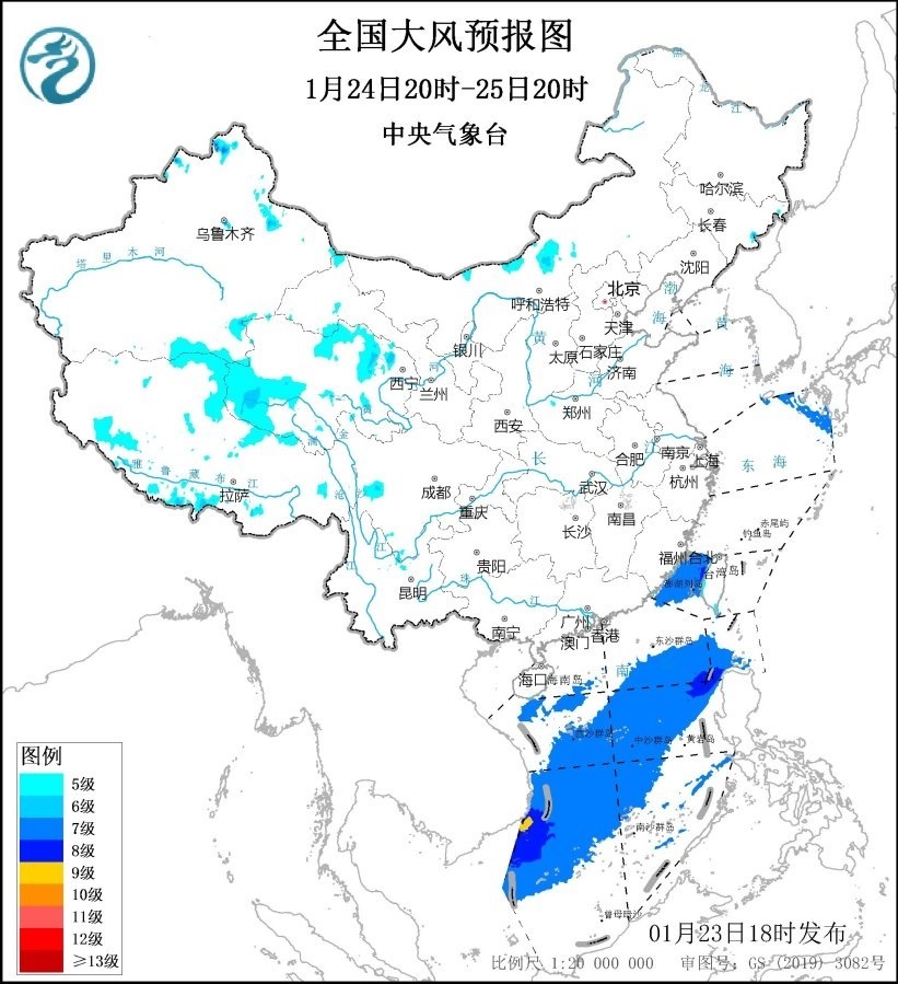 1月24日20時至25日20時,青海北部和西部、福建沿海等地部分地區(qū)有5~6級、陣風(fēng)7級的大風(fēng);臺灣海峽、巴士海峽、南海大部海域?qū)⒂?~8級、陣風(fēng)9~10級的大風(fēng),其中南海西南部的部分海域風(fēng)力可達9級、陣風(fēng)10級。