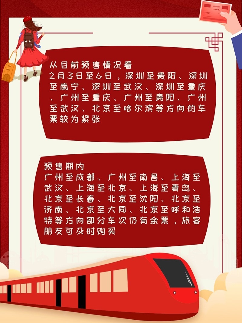從目前預售情況看,2月3日至6日,深圳至貴陽、深圳至南寧、深圳至武漢、深圳至重慶、廣州至重慶、廣州至貴陽、廣州至武漢、北京至哈爾濱等方向的車票較為緊張。預售期內(nèi),廣州至成都、廣州至南昌、上海至武漢、上海至北京、上海至青島、北京至長春、北京至沈陽、北京至濟南、北京至大同、北京至呼和浩特等方向部分車次仍有余票,旅客朋友可及時購買。