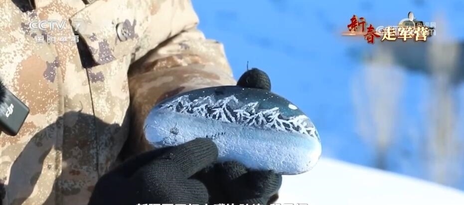 新疆軍區(qū)紅山嘴邊防連 段昱恒:我畫的這塊石頭,這里是我們紅山嘴邊防連的一個(gè)哨樓,這里是我們一起來(lái)的6名新兵,從哨樓出來(lái)準(zhǔn)備去巡邏,前方有冰河,有雪山。在這里我還畫了一條龍,新的一年是龍年,我也希望大家龍馬精神,見龍皆是福。