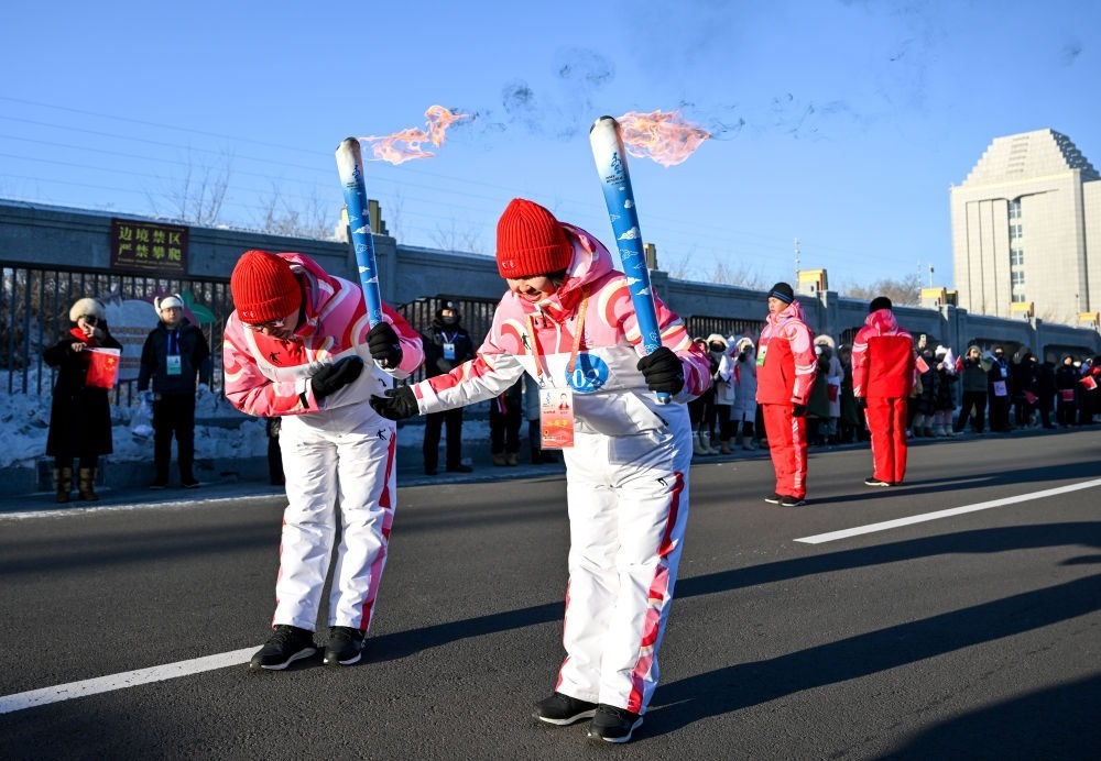 ??2月3日,在內(nèi)蒙古呼倫貝爾市滿洲里國門景區(qū),火炬手包玲玲(右)和錢卓在火炬?zhèn)鬟f活動中。新華社記者 連振 攝