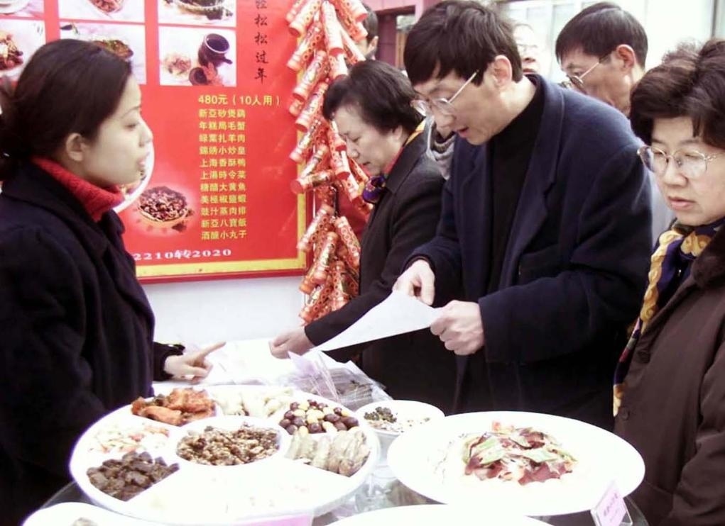 2002年2月2日,上海市民在位于南京西路休閑街區(qū)的 “年夜飯一條街”上選擇、預(yù)訂年夜飯。