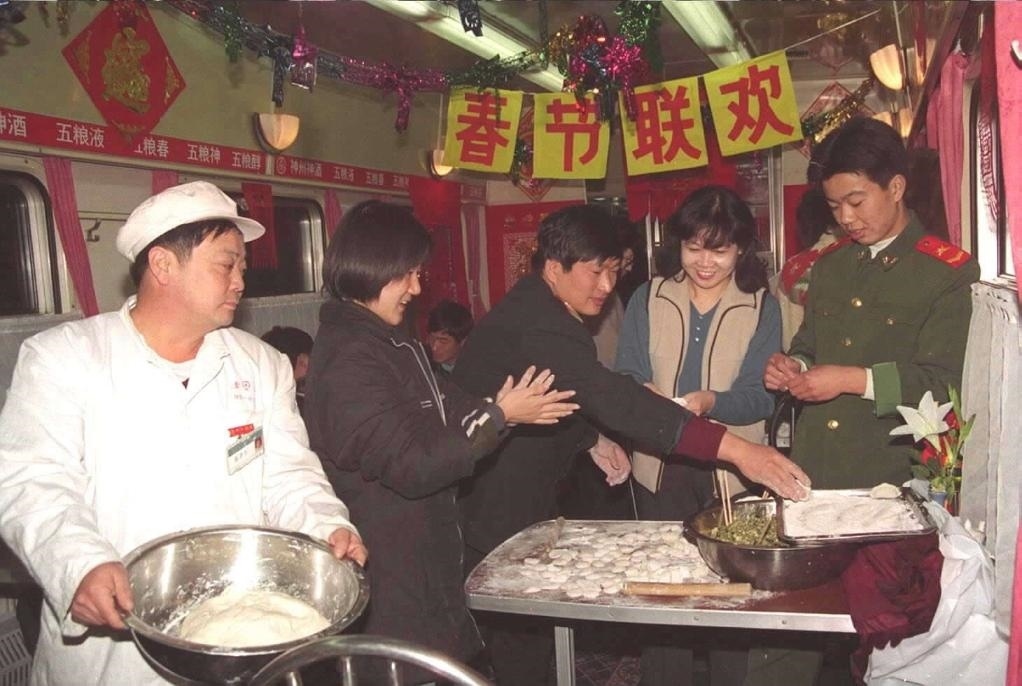 2000年2月5日,天津開往廣州的一列列車上,工作人員為旅客準(zhǔn)備了熱氣騰騰的餃子,還精心編排了豐富多彩的文藝節(jié)目。