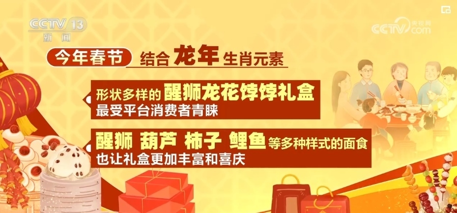 不僅如此,2024年春節(jié),結(jié)合龍年生肖元素,形狀多樣的醒獅龍花餑餑禮盒最受平臺消費(fèi)者青睞。而醒獅、葫蘆、柿子、鯉魚等多種樣式的面食,也讓禮盒更加豐富和喜慶。