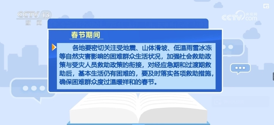 各地要密切關注受地震、山體滑坡、低溫雨雪冰凍等自然災害影響的困難群眾生活狀況,加強社會救助政策與受災人員救助政策的銜接,對經(jīng)應急期和過渡期救助后,基本生活仍有困難的,要及時落實各項救助措施,確保困難群眾度過溫暖祥和的春節(jié)。