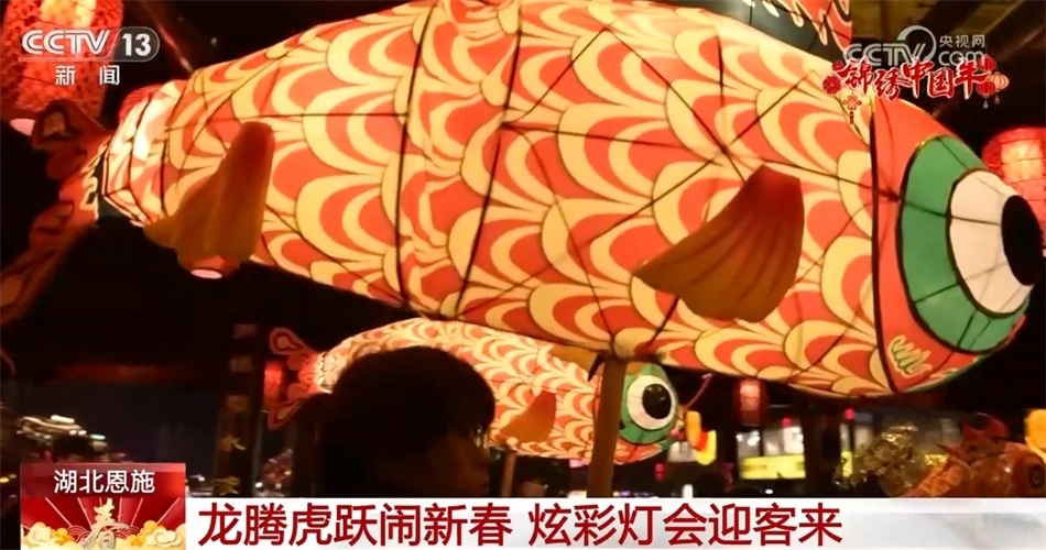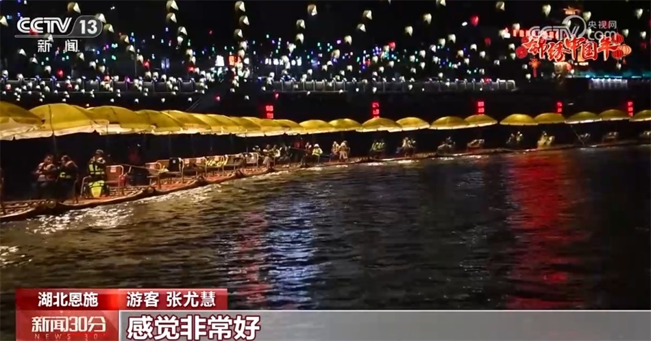 在湖北恩施,夜幕下的宣恩貢水河兩岸,各色花燈匯成燈的海洋,燈火璀璨、流光溢彩,非常喜慶熱鬧。各種“龍”元素出現(xiàn)在各個角落,特色美食配美景讓這座小城年味更加濃郁。