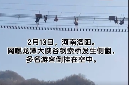 ·洛陽一景區(qū)鋼索橋側(cè)翻多名游客倒掛空中。景區(qū):可能游客自己晃動導(dǎo)致,已全部救下。